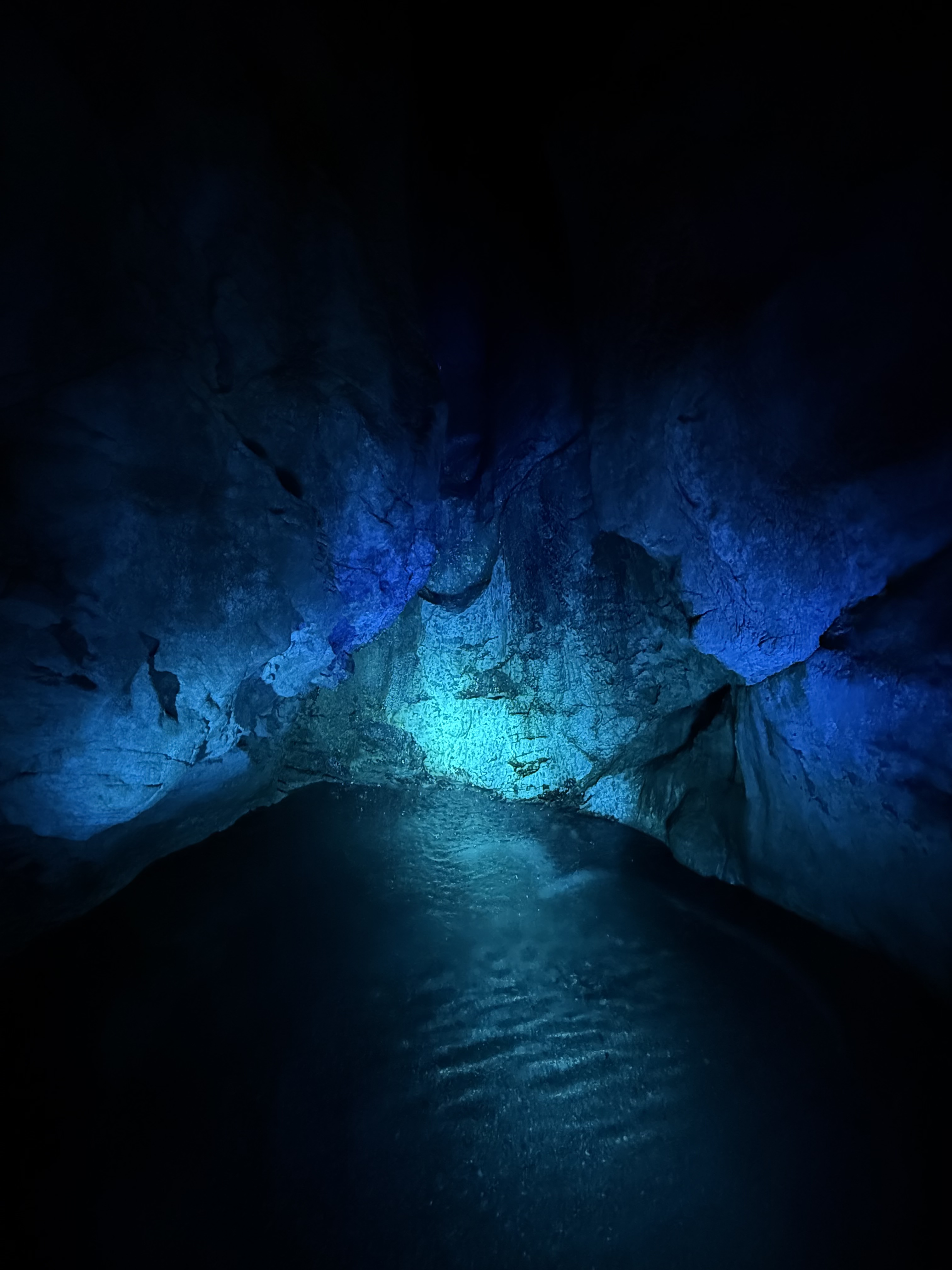 The “ceiling” is low, and the steps steep. The formations are lit in varying shades, mostly marine colors presumably inspired by this place once being covered in water. The earth’s evolution, millennia of rainfall, and ground moisture seeping through have made incredible formations throughout the cave. We continue slowly…stairs give way to dirt and rocks…standing is often not possible…a few places we have to squeeze through.