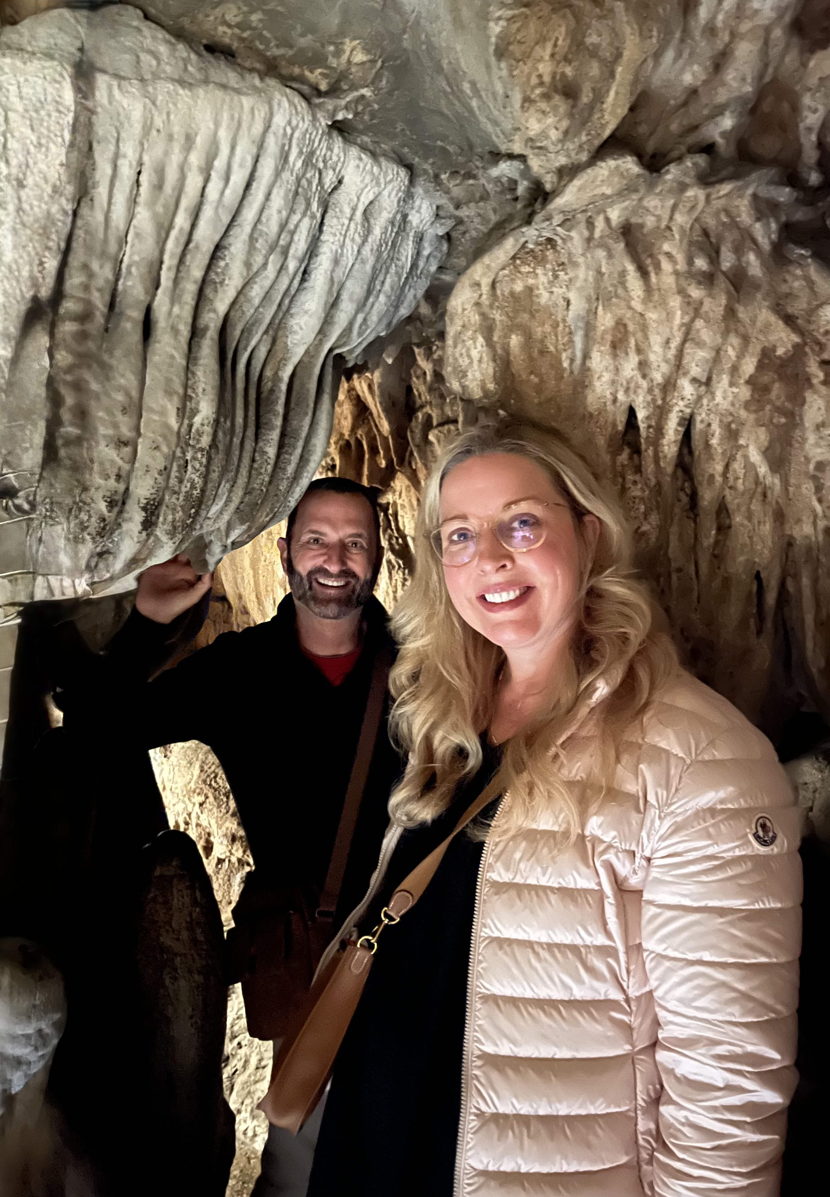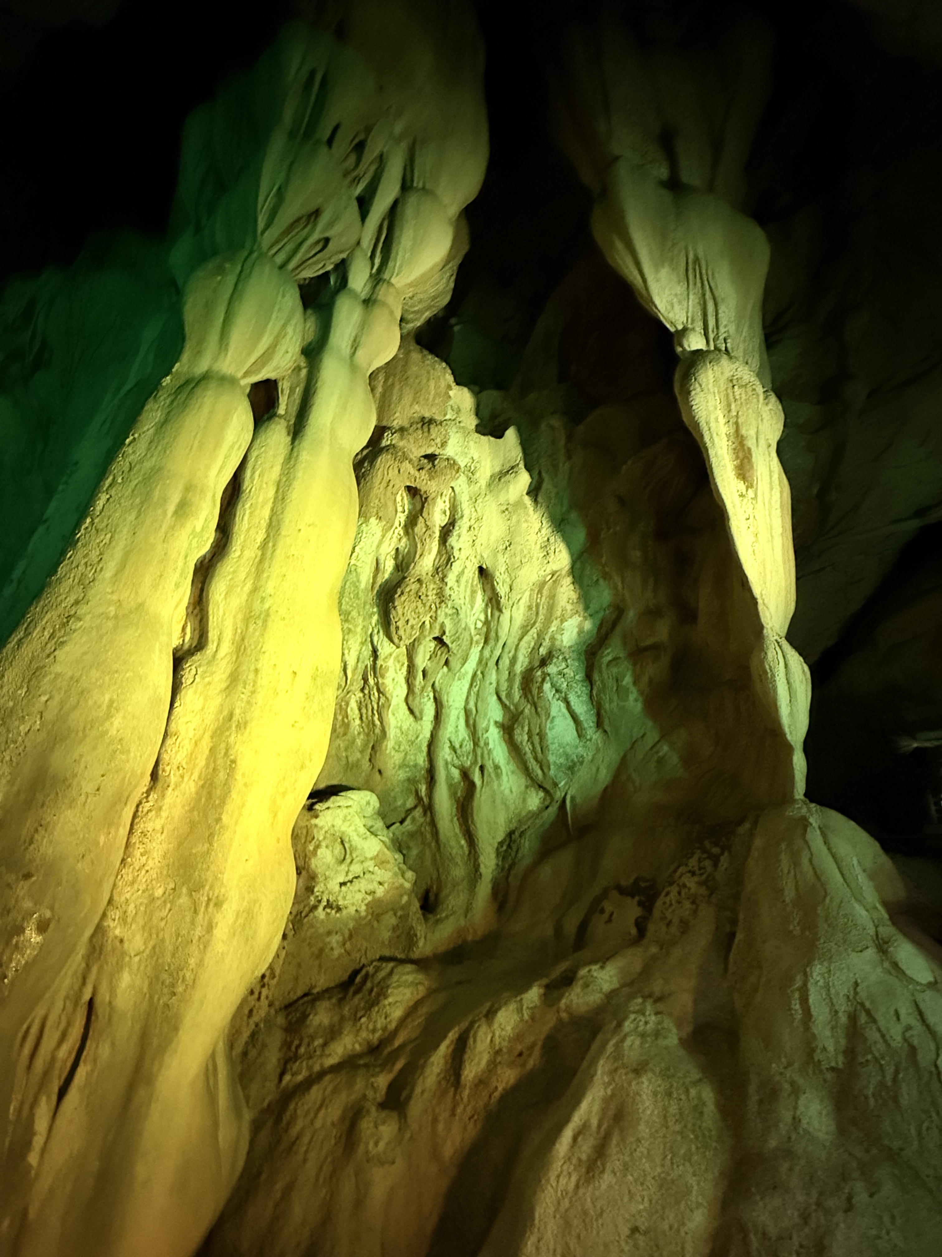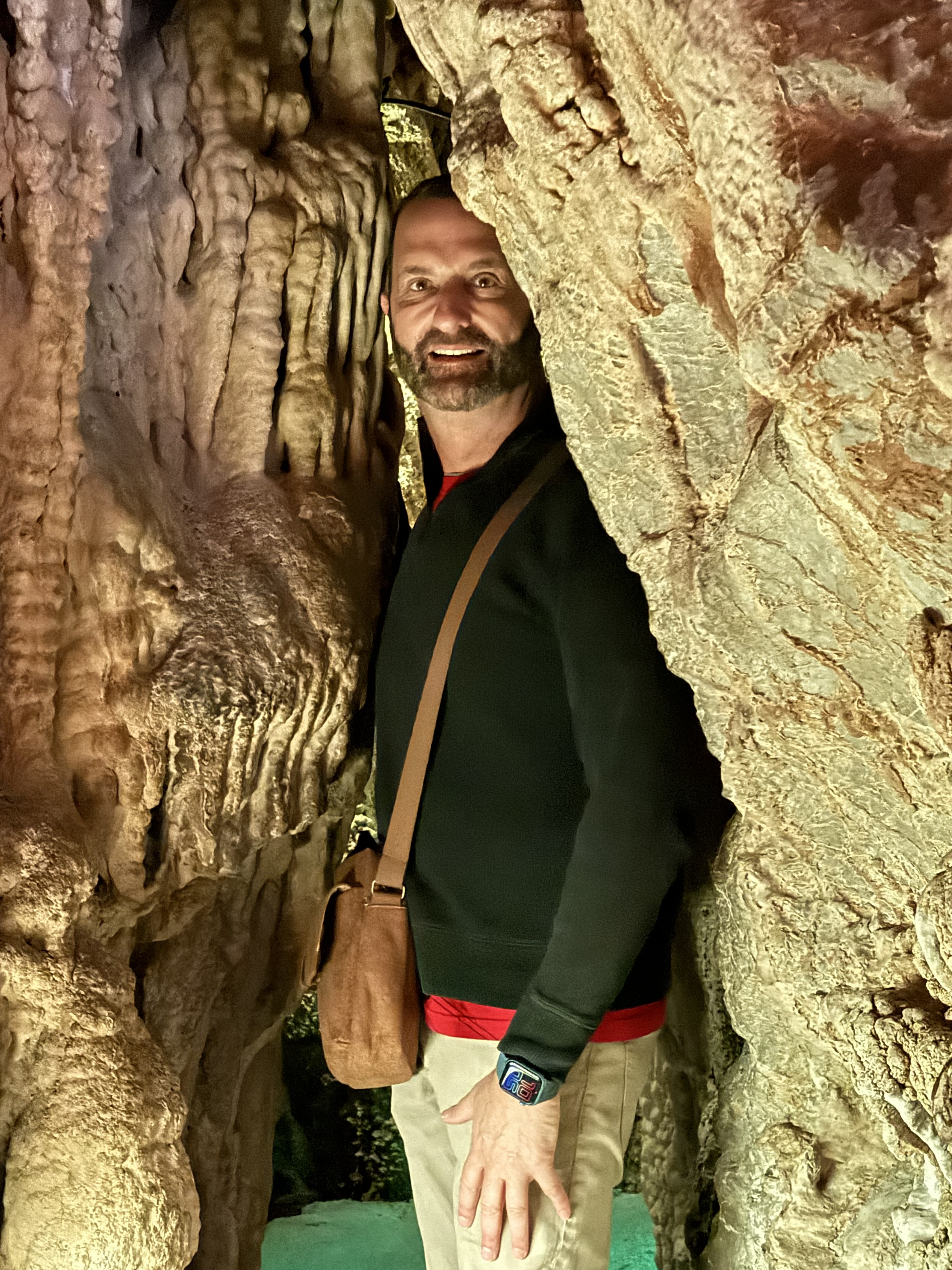 It’s temperate – neither cold nor hot – comfortably neither dry nor wet, and there are really no smells to speak of, strangely enough. There are indeed little bats flying around! Some spaces are tiny…a small tunnel leads to a room of sorts, then another staircase…and after about 30 minutes, we are in a larger chamber. A light show/movie cast upon the wall depicts the beginning of time to humans walking here – in about two minutes. It’s actually pretty cool.
