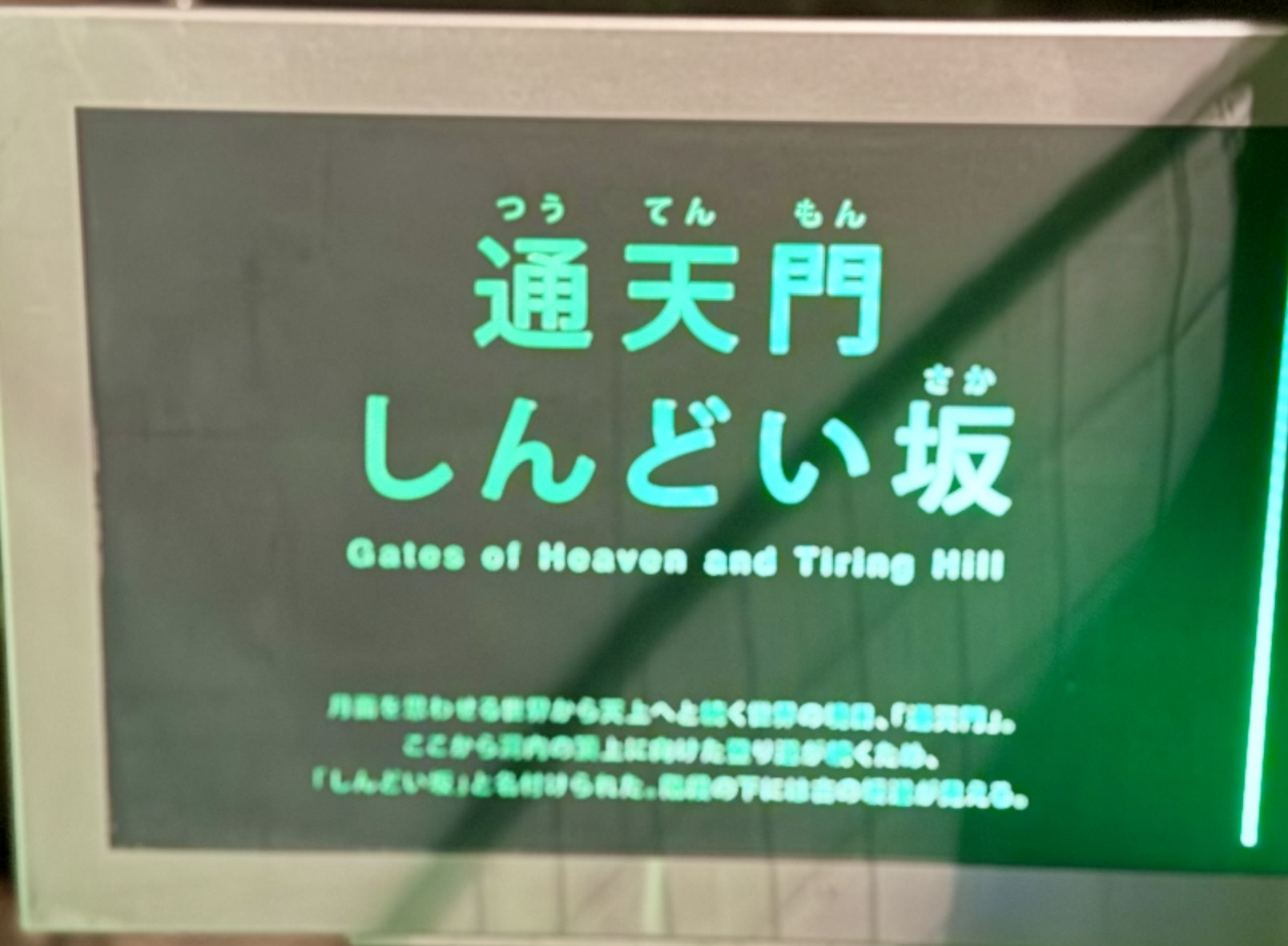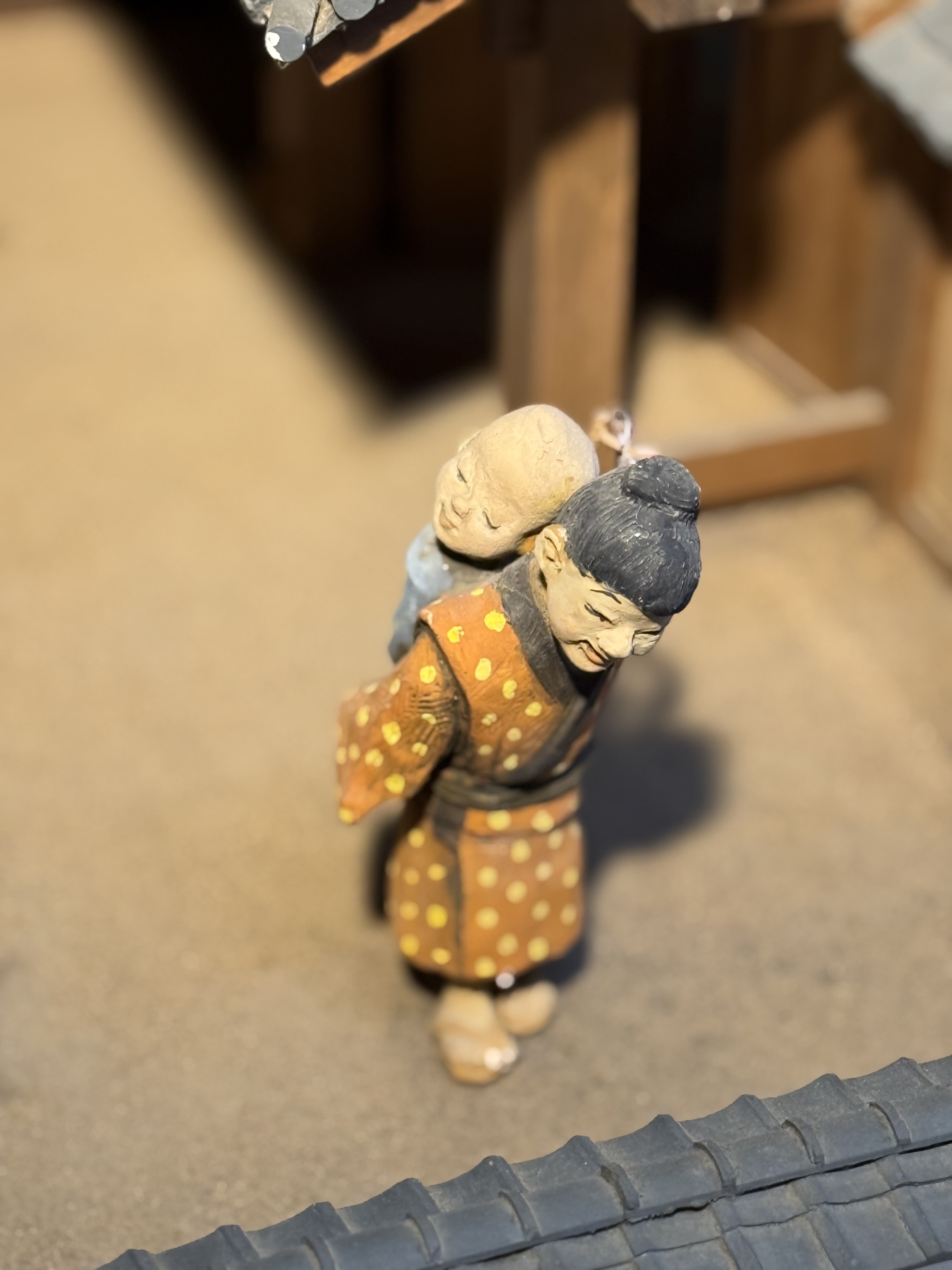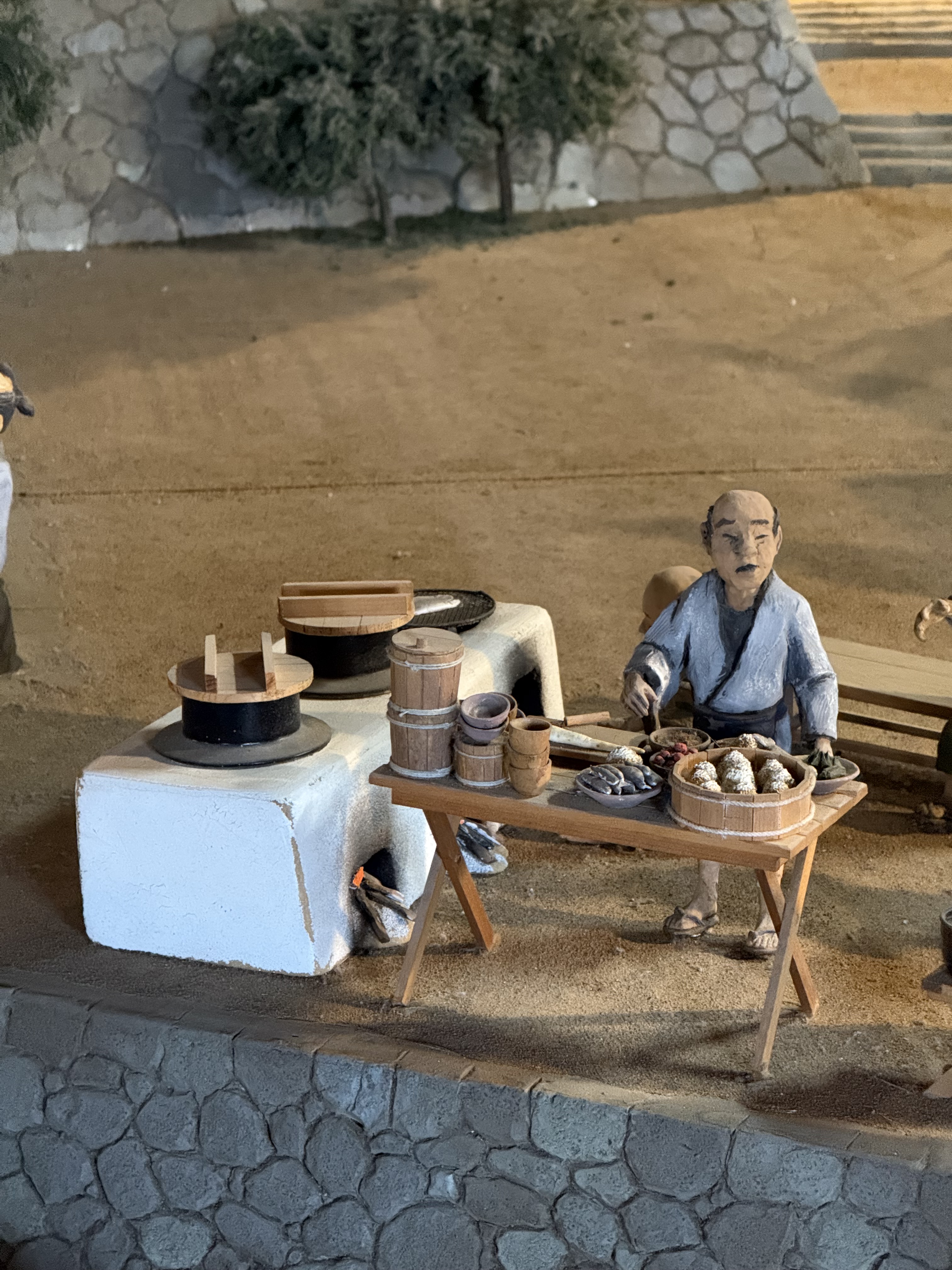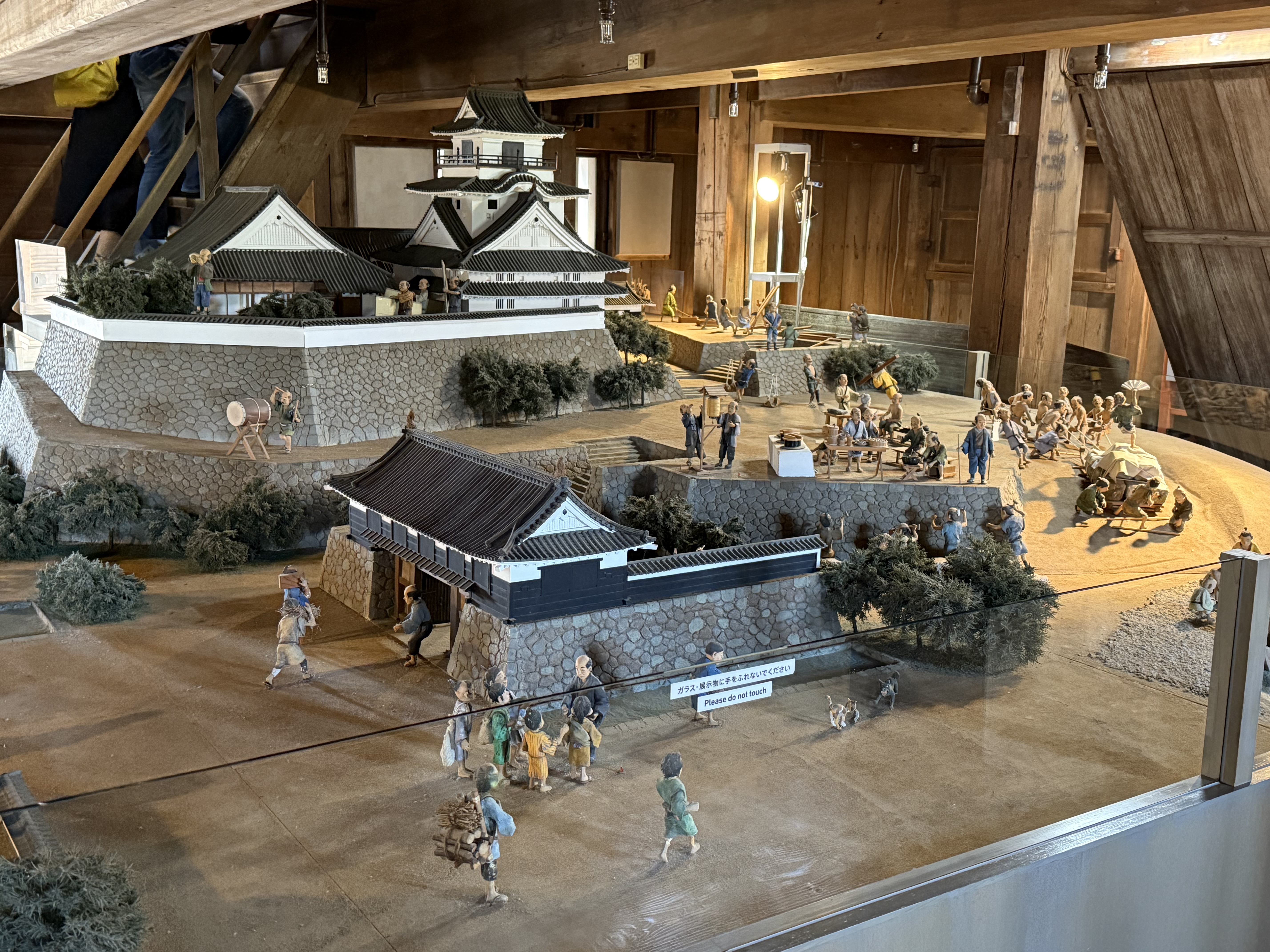 The entrance podium is actually at the back of the structure. Inside the tower are a few displays: this amazing 3D tapestry, and a diorama of the entire complex that was wonderful. Even if the humans and buildings were completely out of proportion, I loved the characters: