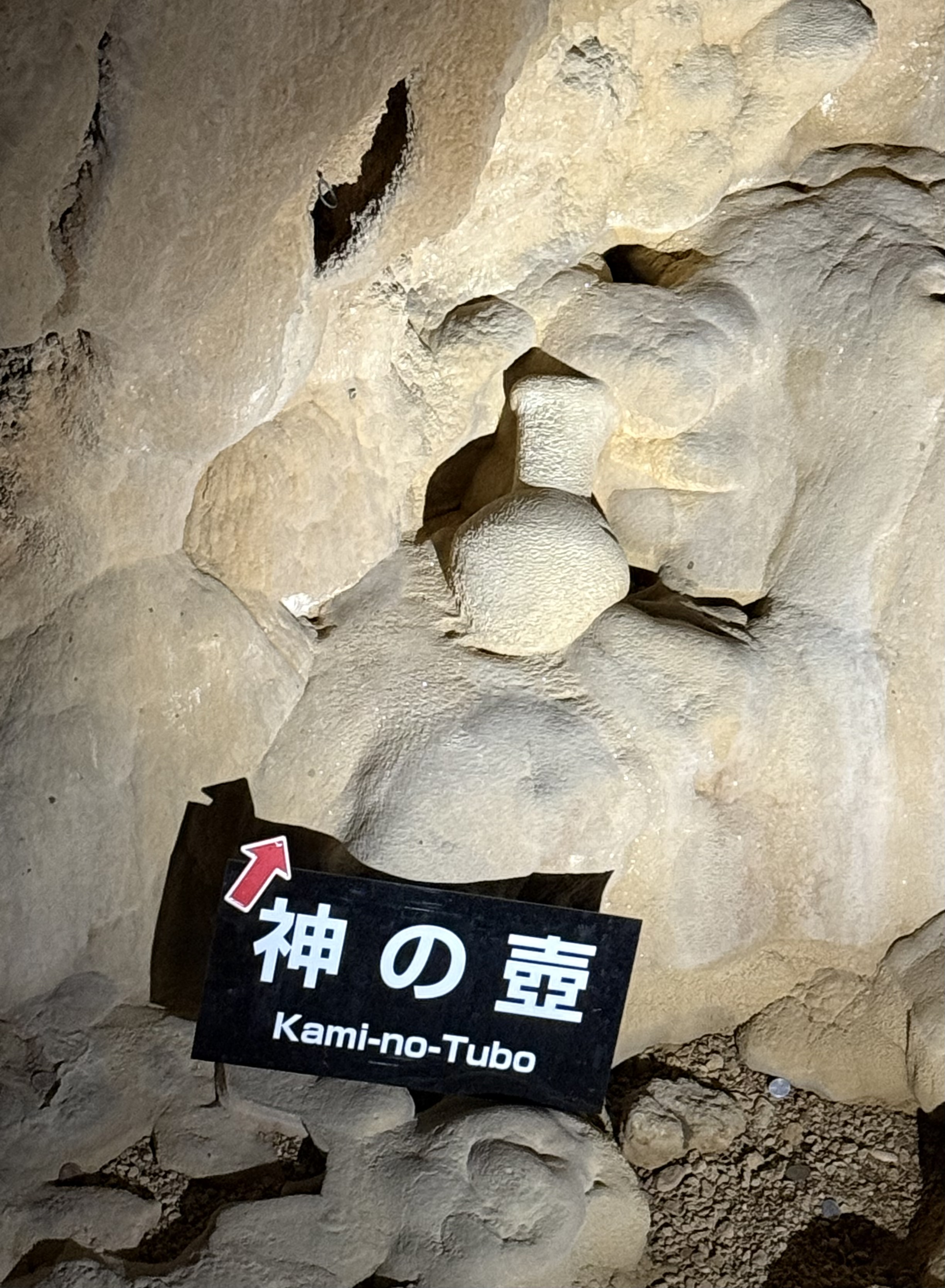 Just around the next bend is evidence of ancient humanity: a vase/urn, and a fire pit. We wonder how you wouldn’t get asphyxiated with a fire burning in here, but it turns out we are very near the upper entrance and fresh air. It is estimated that people occupied the cave around 2,000 years ago, leaving us to wonder what they were like. Perhaps not as “primitive” as you might think…remember this about the same time as Cleopatra. Maybe the cave is where village teenagers came to hang out away from their parents? The small museum after we emerge provides few clues.